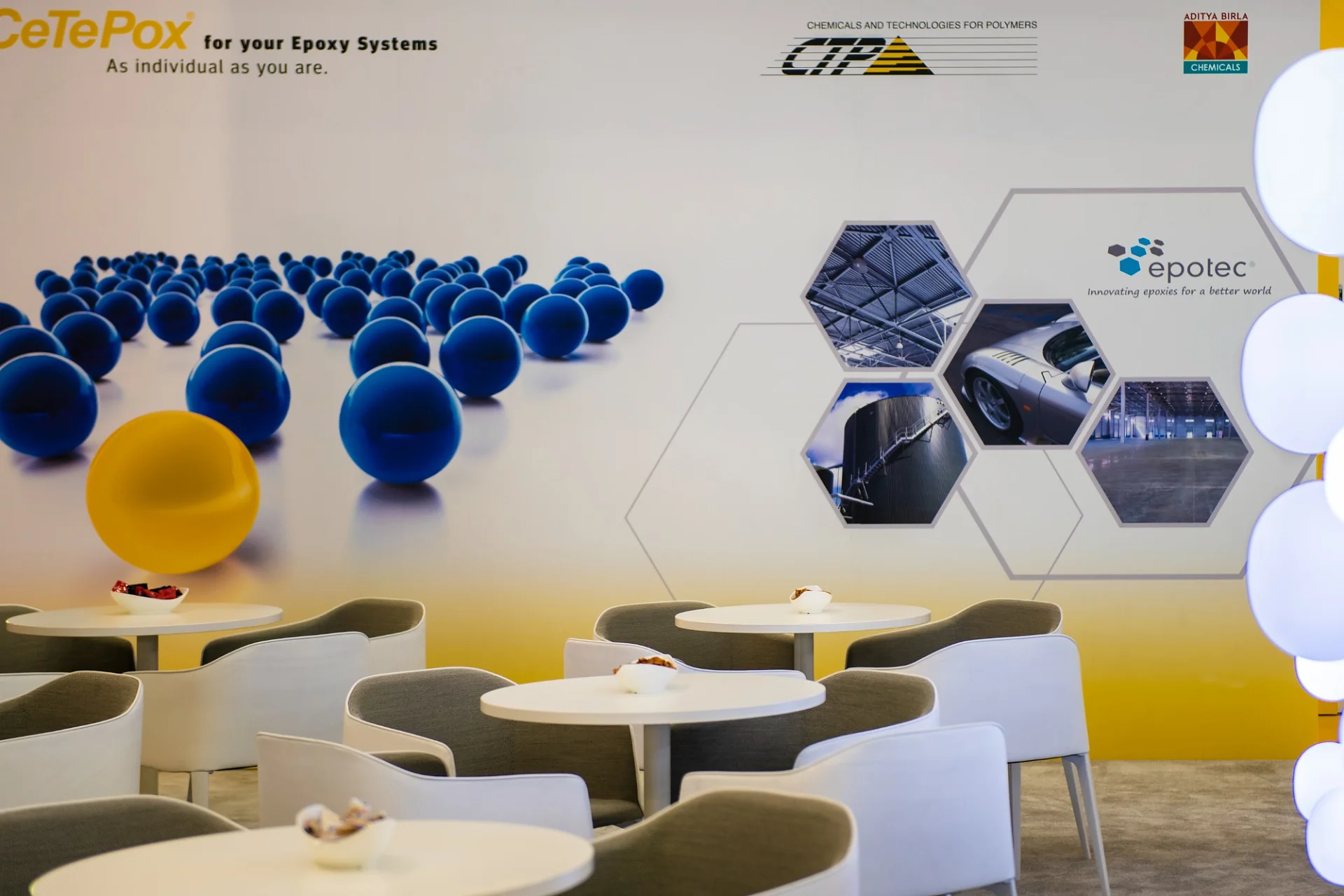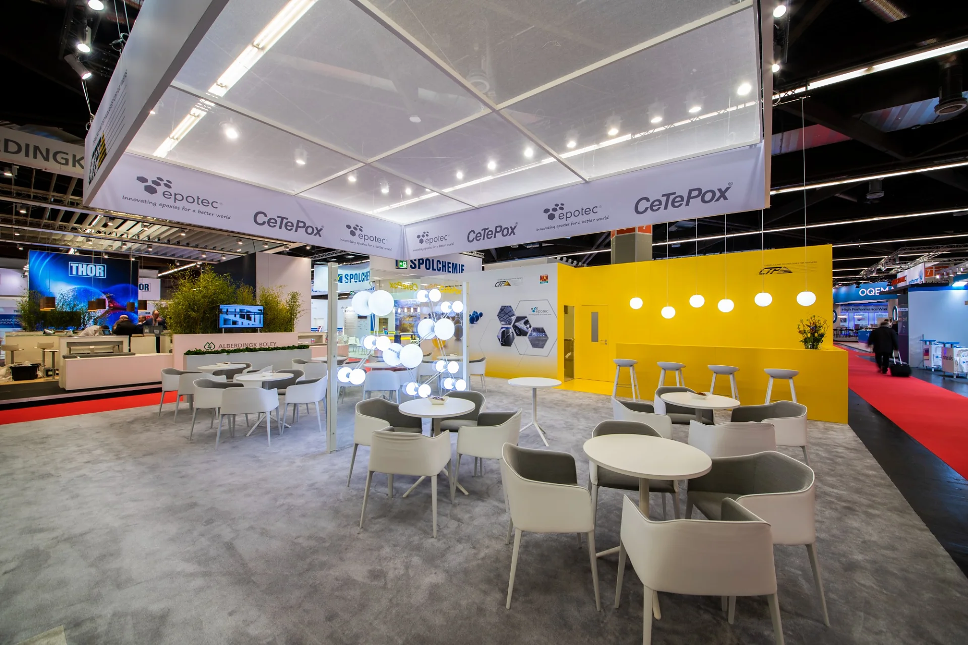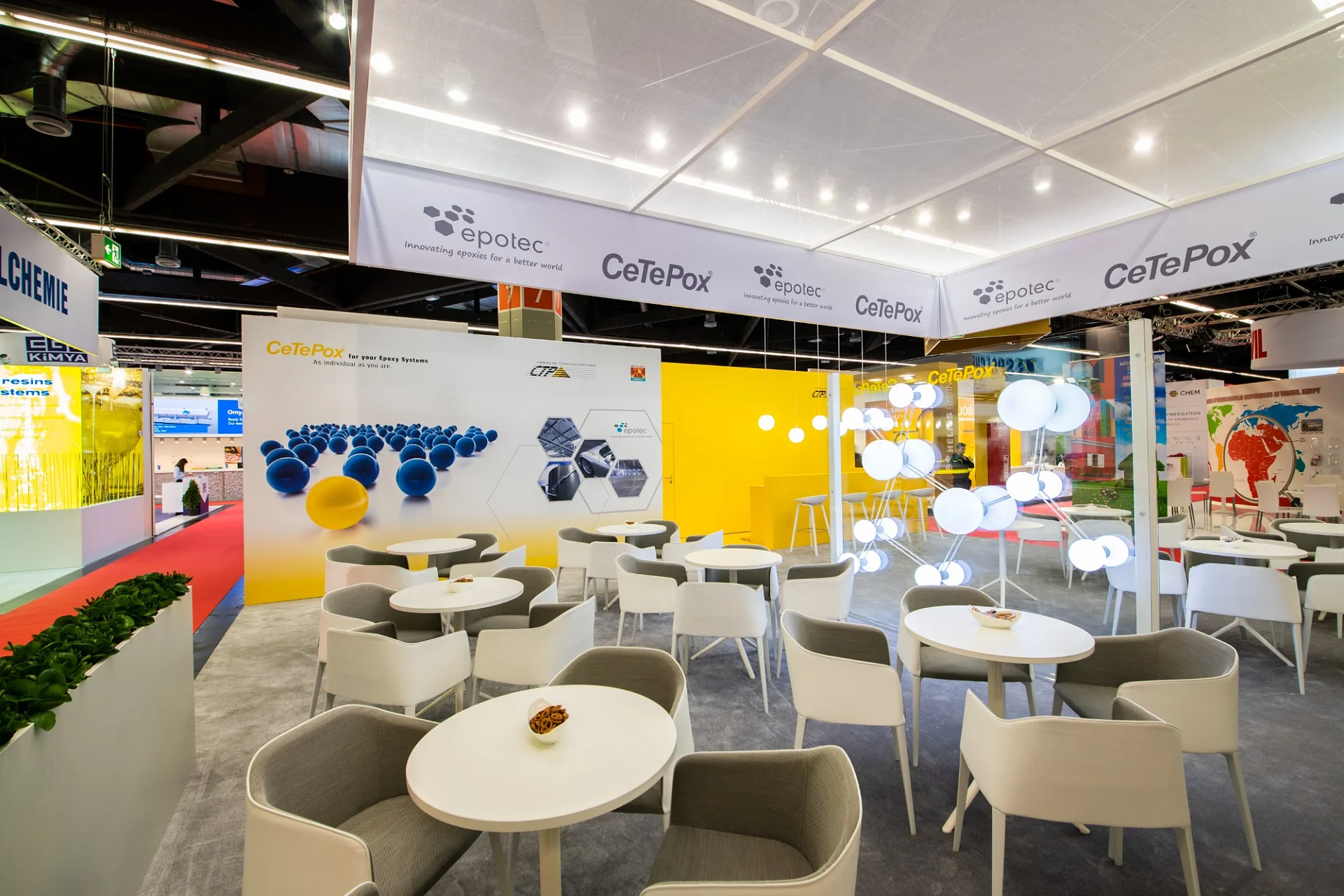 Come together – der Messestand als Plattform für Kommunikation. Einladende Sitzgelegenheiten bilden hier das Zentrum. Die schwebende Deckengestaltung über dem Messestand in Kombination mit der auffälligen Farbgebung, ein leuchtender Gelbton und ein Azurblau, erzeugen hohe Aufmerksamkeit und eine große Wiedererkennung. Das Highlight des Standes ist ein leuchtendes Elektronenmodell.