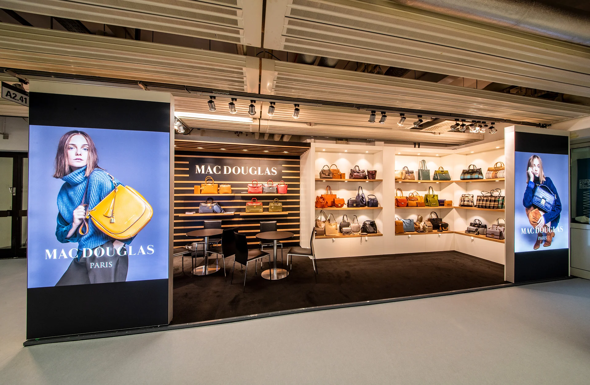 A small exhibition stand with big impact. Generous illuminated graphics with fashion photography, clear shapes and trendy materials offer a special setting for the high-quality products. They are presented here in a classy and effective way.